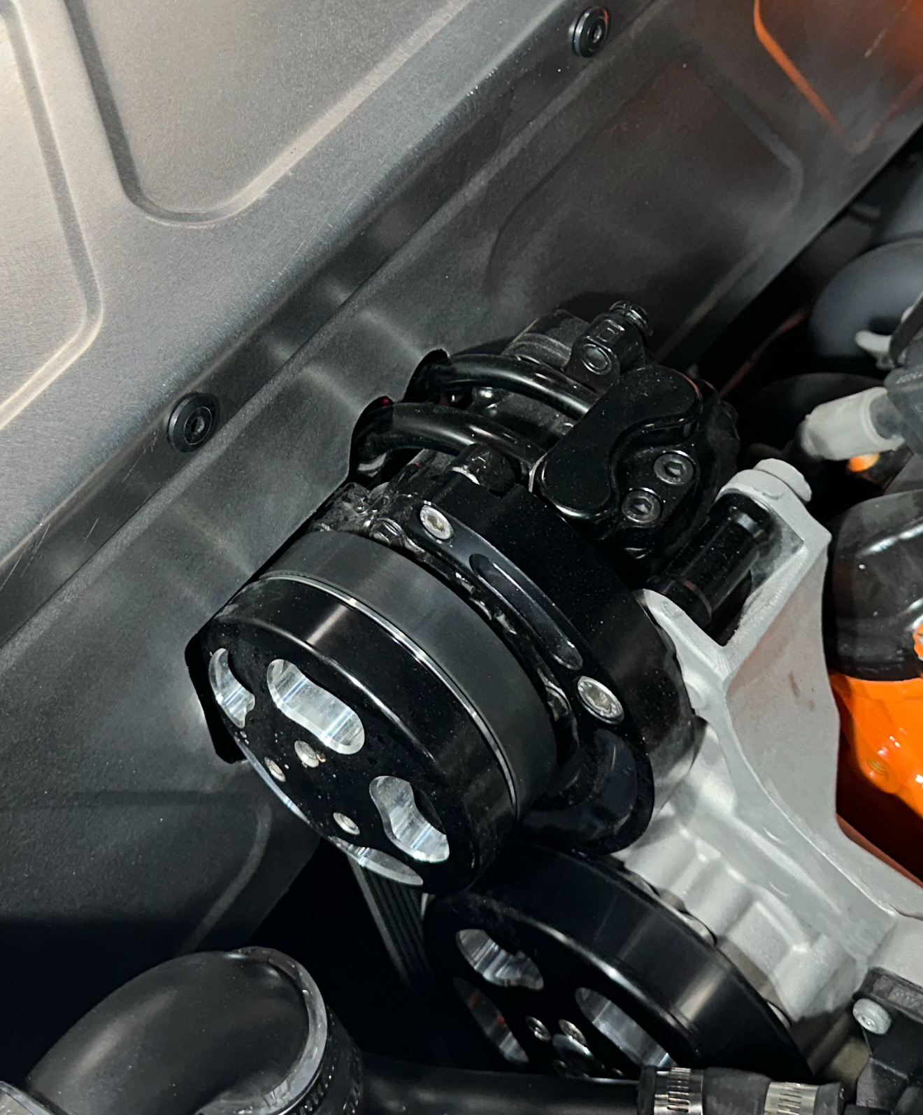 If your accessories are wider than the motor you may have to trim the inner fenders to clear the alternator and A/C compressor. See pictures below.