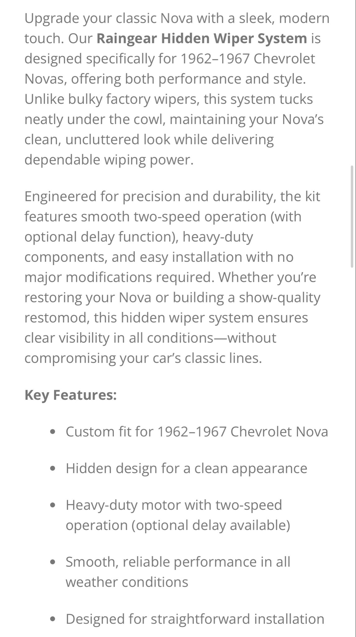 Raingear 1962-67 Nova hidden Windshield Wiper Motor System