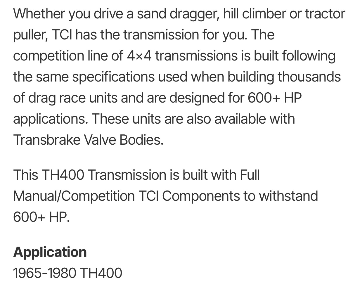 TCI Full Manual Competition TH400 Transmission - Rated for 600+ Horsepower