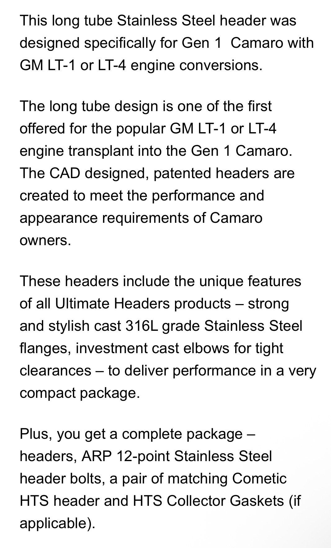 Ultimate Headers LT1/LT4 1rst Gen Camaro Swap Headers